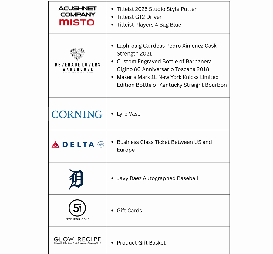 | Generously sponsored by Misto Holdings Corp. & Acushnet Holdings Corp. TSR2 Driver, TSR2 Fairway 15°, TSR2 Fairway 18°, T200 Iron Set (5-W), Vokey SM10 Wedges, 2023 Super Select NP 2 Putter, and Hybrid Stand Bag |
